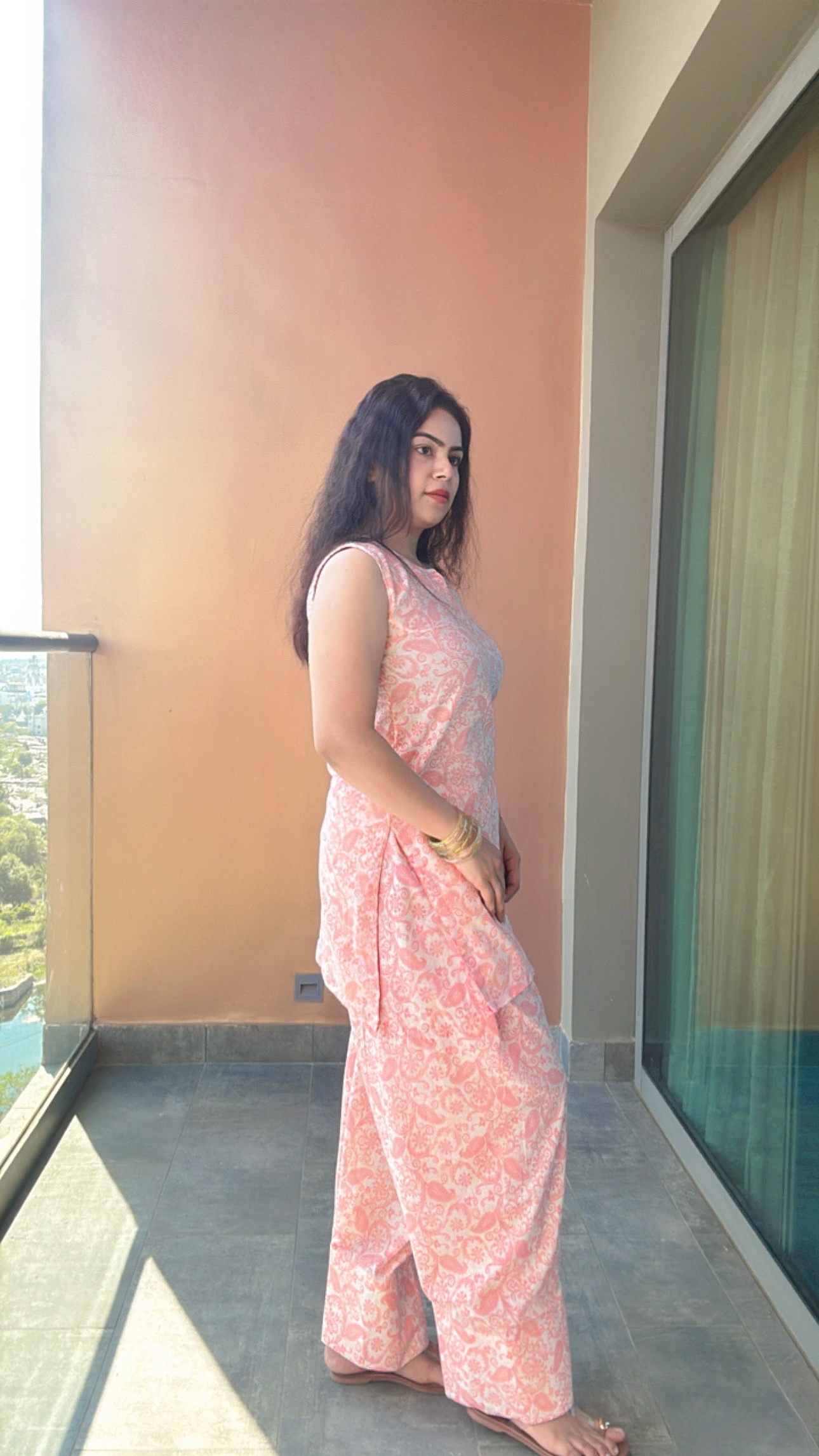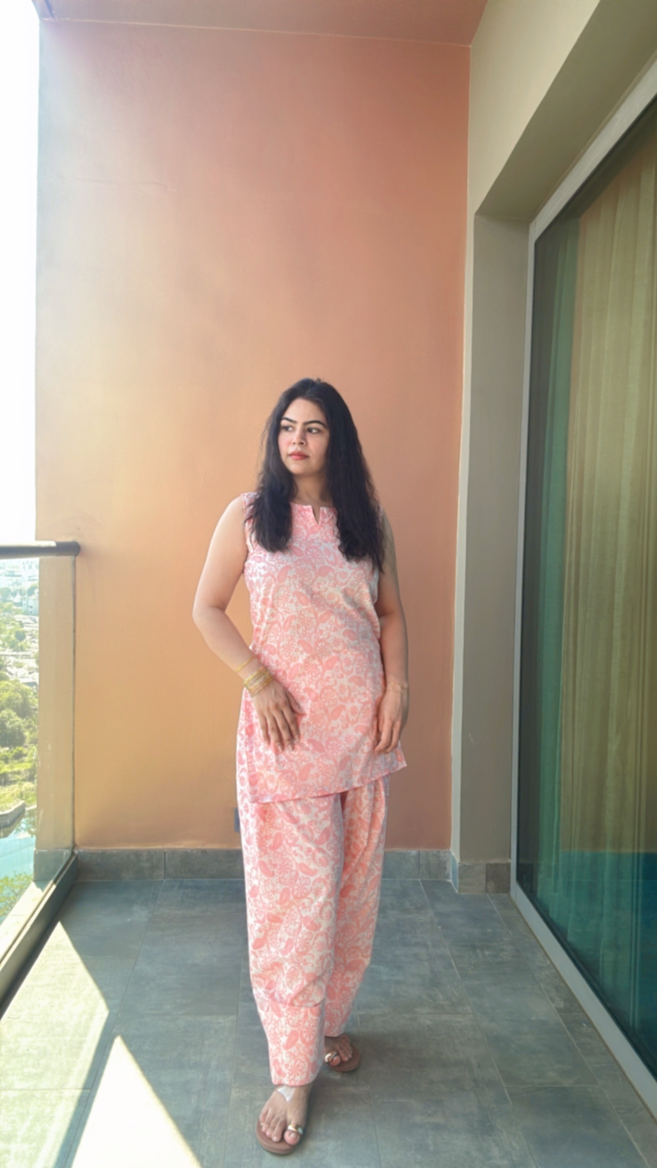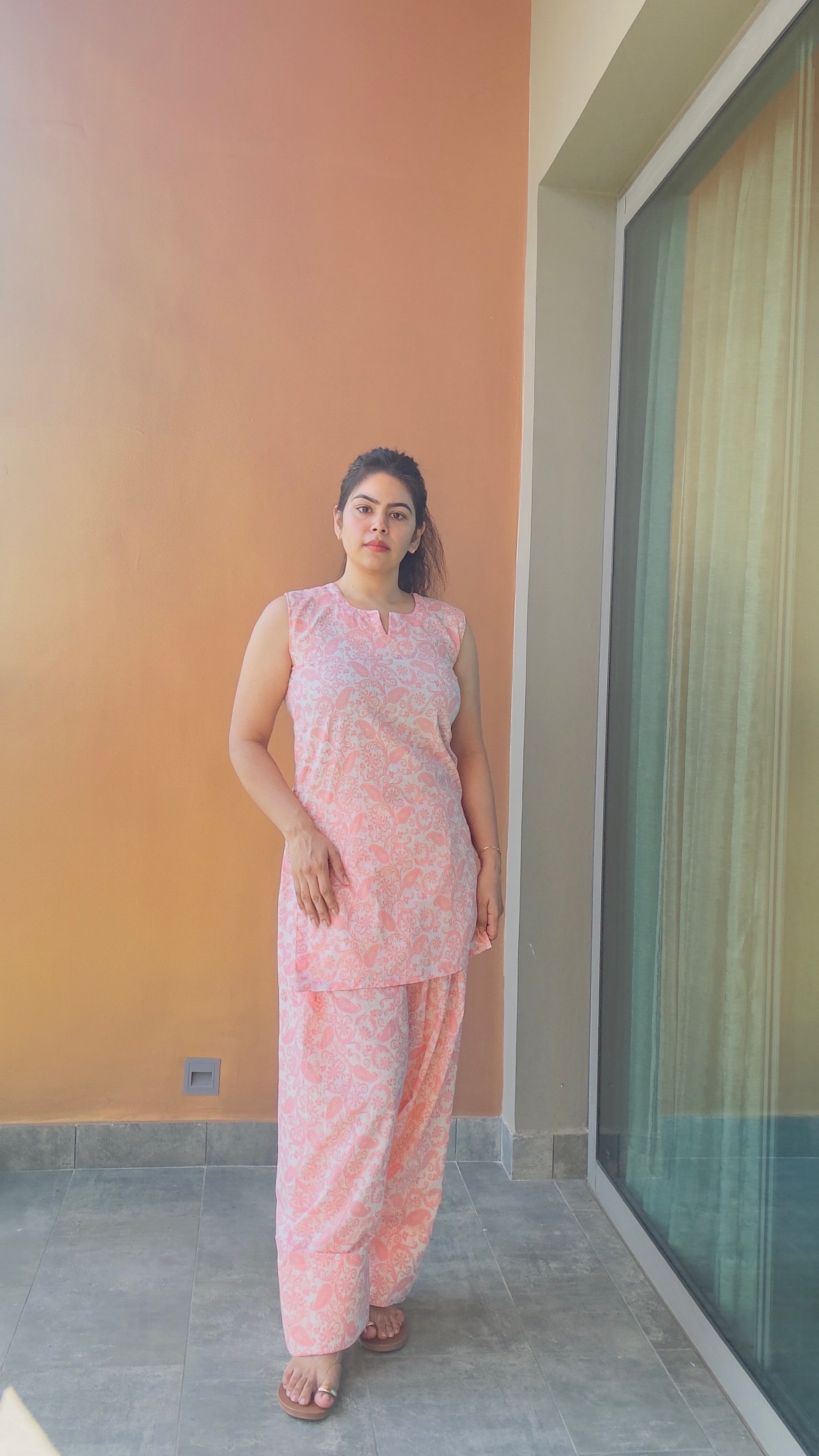 Kurta design- Pakistani loose fit comfortable kurta with mul cotton farsi salwar portrait neck design sleeveless kurta.                                                          Pant design— mul cotton orange and off white farsi salwar.